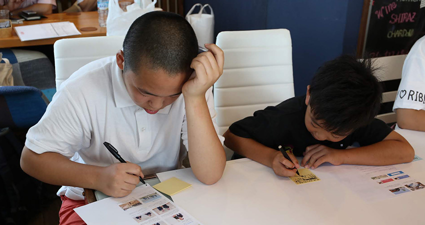 陽射しがいっぱいの会場に、10人の小中学生が集まりました。今日は2つのチームに分かれてアイデアを出していきます。もちろんみんな、フューチャー・ランゲージをつくるのは初めて。「今日って何するの?」「よくわかんない」「でも、ちょっと知ってるよ」などなど、知っている人同士はさっそくおしゃべりで盛り上がっています。