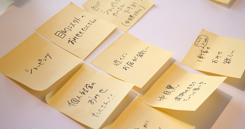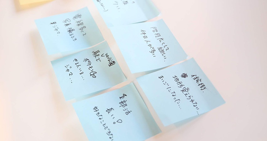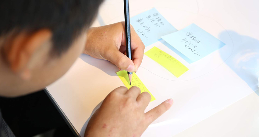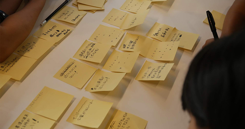 書き始めると、止まりません。アトラクションがいっぱいある(絶叫系)、水族館、動物園、…。ワクワクするようなミライが、どんどん黄色い付箋に書かれていきます。中学生からは、「両耳イヤホンに厳しく」など、社会的な目線からの意見も。テーブルの上の大きな台紙が、みんなの理想でどんどん埋まっていきました。