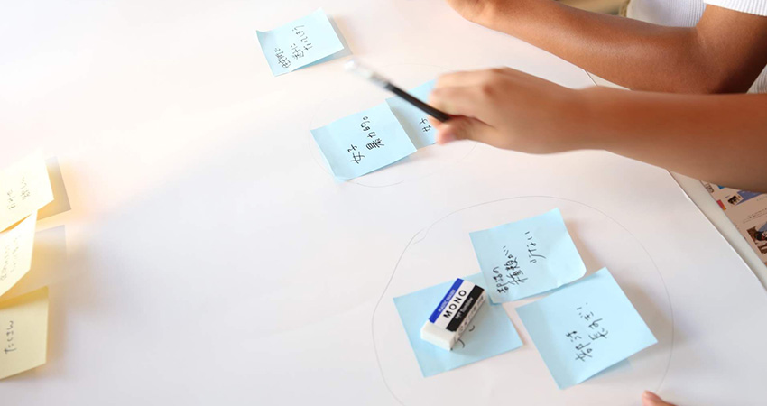 ここで、意見をいったん整理します。近い意見をまとめてグループ分けし、困っていること(青)と、それを解決した先にある理想のミライ(黄色)を組み合わせて線でつないでいきます。