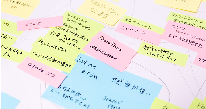 さて、みなさんが描く理想の街がたくさん出てきました。では、次は困っていることや悩みを青い付箋に書きましょう。個人的なことでも構いません。そして黄色付箋の内容に対応するものをその下に貼ってください。例えば「街が人工的で疲れる」には「自然が豊か」が関係するとか。