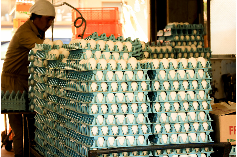 鶏が生んだ卵を集卵することからはじまります。一般的に、鶏は朝からお昼前くらいの間に卵を生むといわれていますが、機械ではないのでみんな同じ時間ではありません。午前の時間を使って、ひとつ一つ手作業で卵を集めています。