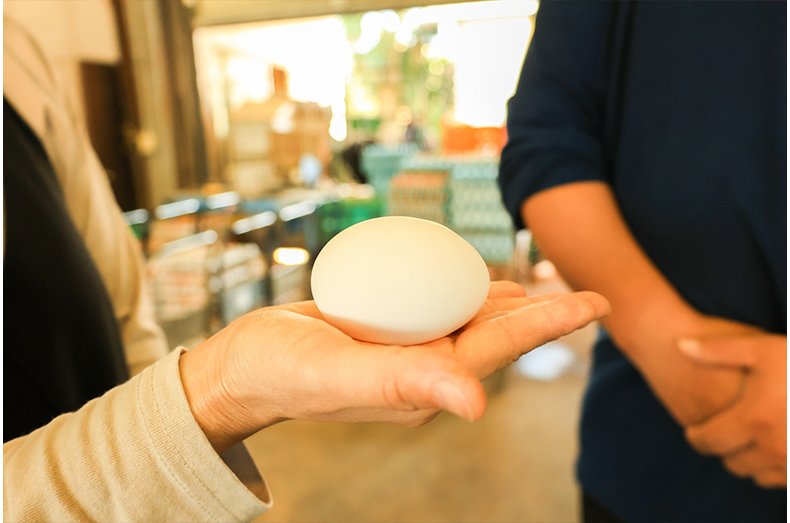 お客様からは「味が濃い」「白身がおいしい」というお声をいただきます。割ってみると、白身が盛り上がっていると思います!