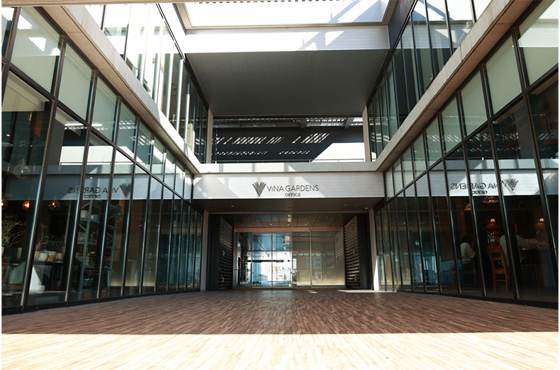 さらには広々としたエントランスアプローチ、辻正昭氏によるガラスアートが展示された開放的なエントランスホールやそこから望む水景など、ViNA GARDENSオフィスは働くみなさんに癒しや創造性を育む空間としてのポテンシャルを備えています。ぜひ多くの方に訪れていただき、それを感じていただければと思っています。