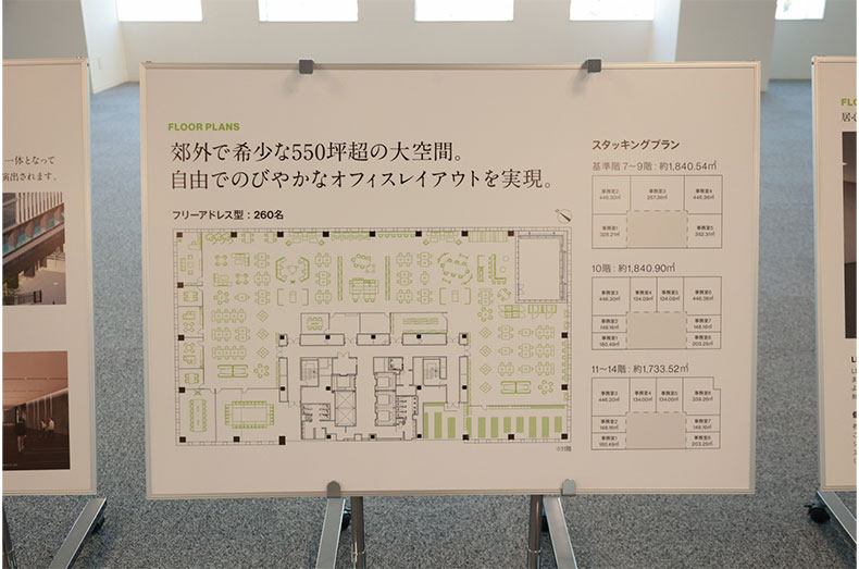 フロア面積約550坪、天井高2.8m、最大奥行約17.6mの柱のない開放的な空間