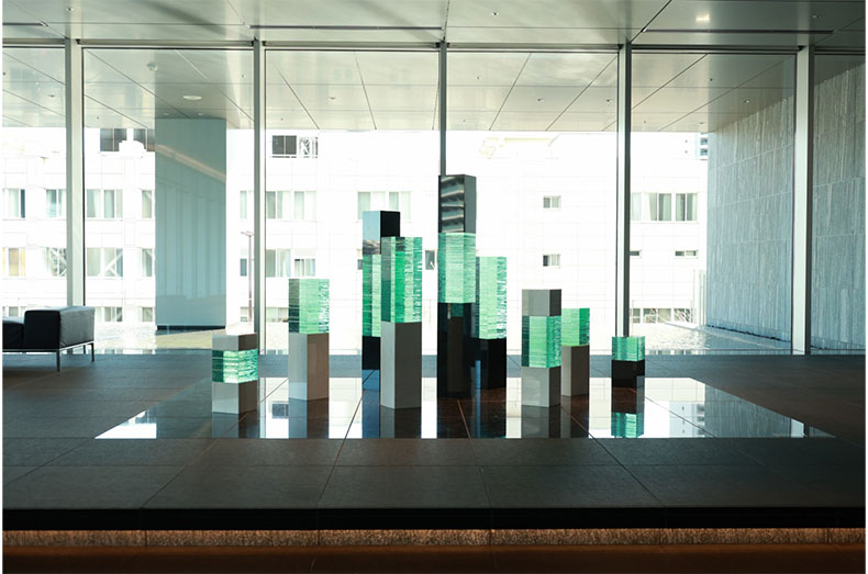 ViNA GARDENS オフィスエントランスホールに展示された辻さんのガラスアート『Phase formation』