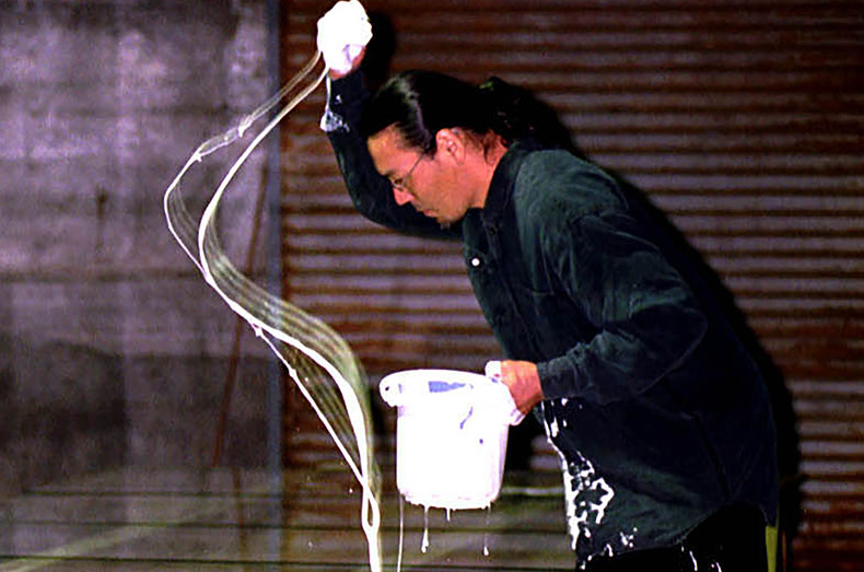 これは1997年に古い酒蔵で開催した個展で、4m×8mのガラスの板をハンマーで割り、積み重ねていきながら「ガラスの絨毯」のような作品に仕上げるという実験的な表現を行なったことがきっかけでした。地元のミュージシャンが奏でる音楽とともに私がガラスをハンマーで一心不乱に割る前半と、出来上がった作品にハロゲンライトや和ろうそくの光を当て、ガラスに反射して複雑に変化する光の様を表現する後半の2部構成で組み立てました。制作の最終工程は一般にも公開し、大きな反響を呼びました。