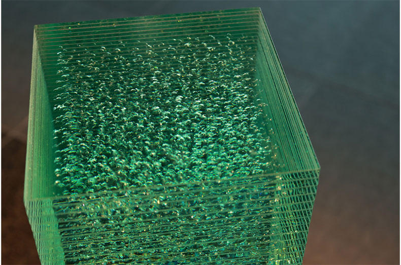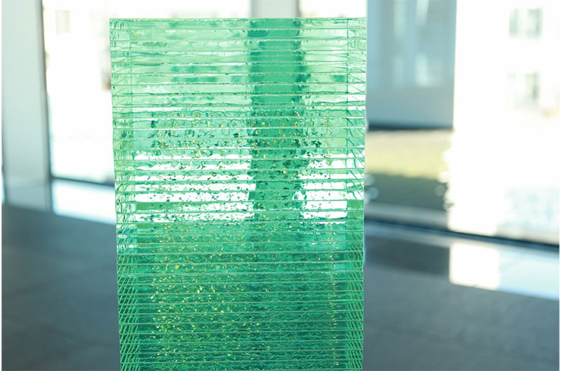 約600枚ものガラス板を積み重ねてオブジェを創造しています