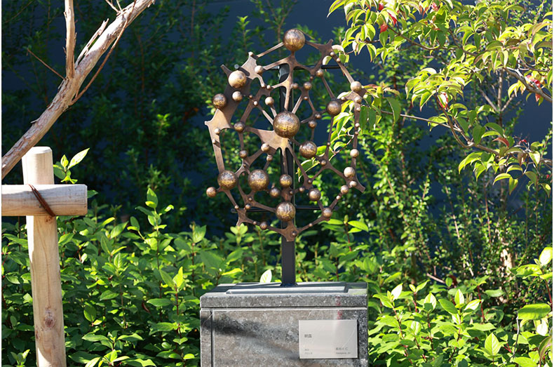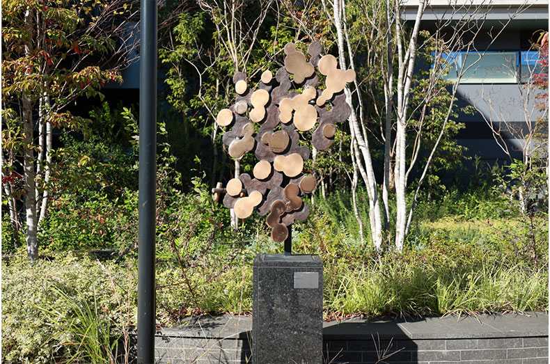 オフィス・サウスプロムナードに設置した作品でも、身近な自然の中で印象的な光の風景をブロンズ像で表現しています。木々の間から溢れる光を形にした「木漏れ日」、蜘蛛の巣についた水滴を模した「朝霧」、冬の寒い朝の水たまりをモチーフにした「薄氷」など、どれも意識的に目を向ければ気がつく、身の回りの自然で発見できるワンシーンです。この小道を通る人たちに、身近な自然を発見する楽しさ、美しさに気がついてもらえたらと思っています。
