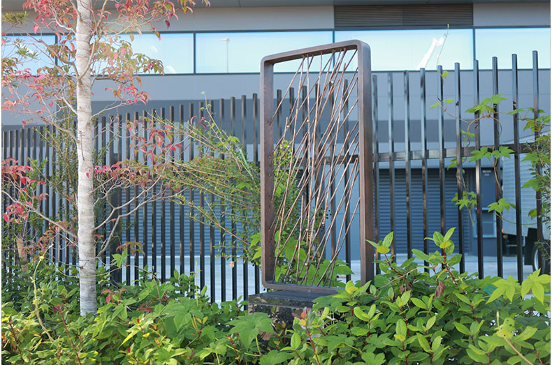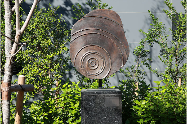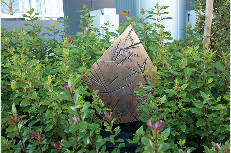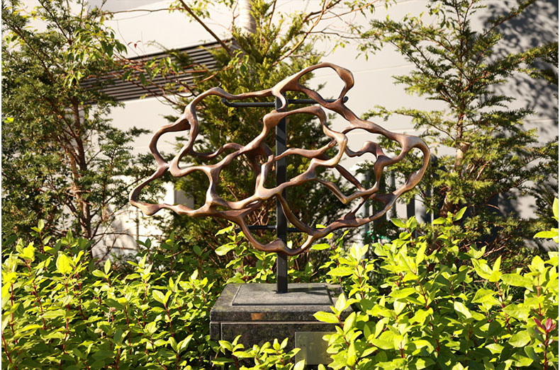 光を表現するには、明と暗、そしてその中間にあるグラデーションを使い分ける必要があります。今回の作品の素材として、またオフィスの建物脇でありながらも、地域住民の散歩道にもなるという立地の特性を考え、適度な格式と親しみやすさを感じさせるブロンズは、素材としては最適なチョイスでした。