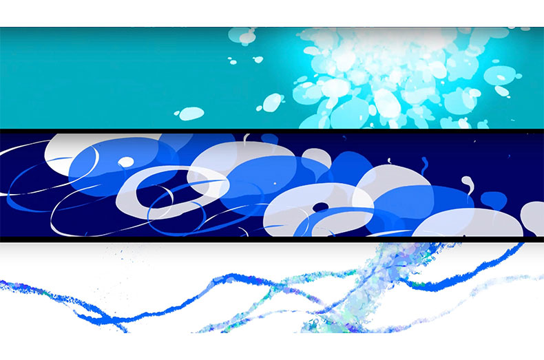それを参考にできあがった作品は、私なりの感性で頭に描いた水の彫刻を流動的なアニメーションとして表現したものです。青く彩られた水の緩急のある動きを見て、一生懸命頑張った結果、疲れ、傷ついた心を癒してくれる作品にしたいという私の思いが伝わる映像に仕上がっていれば嬉しいです。