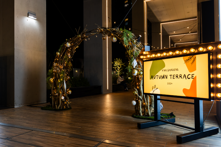 12月に入り、ViNA GARDENSのイルミネーションがクリスマスの装いに。ViNA GARDENS PERCH セントラルプロムナード入口のアーチには「Merry Christmas」のメッセージが飾られ、オーナメントはクリスマスらしい赤とゴールドに衣替えしました。