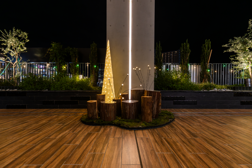 傍におかれたテーブルに座り、静かな冬の夜を過ごすのもおすすめ。目の前にはイルミネーション、頭上には海老名の夜空が広がります。
