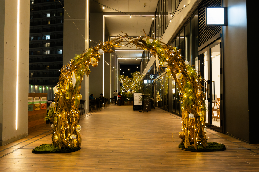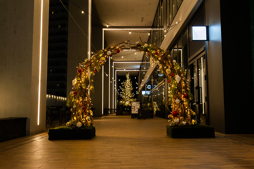 セントラルプロムナードの入口には、小さな木のアーチが。あたたかみのあるゴールドの電飾がほのかに光っています。